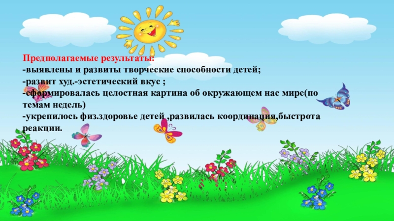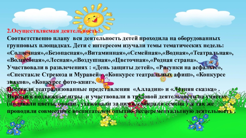 Дети с интересом изучали темы тематических недель: «Солнечная»,«Безопасная»,«Витаминная»,«Семейная»,«Водная»,«Театральная»,«Волшебная»,«Лесная»,«Воздушная»,«Цветочная»,«Родная страна».