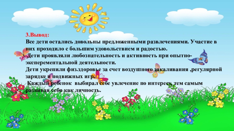 Дети укрепили физ.здоровье за счет воздушного закаливания ,регулярной зарядке и подвижных игр.