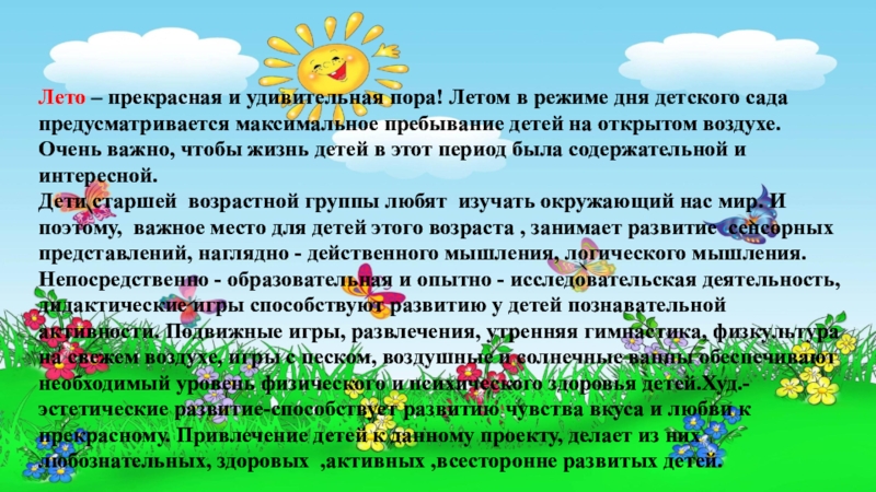 Дети старшей возрастной группы любят изучать окружающий нас мир. И поэтому, важное место для детей этого возраста , занимает развитие сенсорных представлений, наглядно - действенного мышления, логического мышления. Непосредственно - образовательная и опытно - исследовательская деятельность, дидактические игры способствуют развитию у детей познавательной активности. Подвижные игры, развлечения, утренняя гимнастика, физкультура на свежем воздухе, игры с песком, воздушные и солнечные ванны обеспечивают необходимый уровень физического и психического здоровья детей.Худ.-эстетические развитие-способствует развитию чувства вкуса и любви к прекрасному. Привлечение детей к данному проекту, делает из них любознательных, здоровых ,активных ,всесторонне развитых детей.