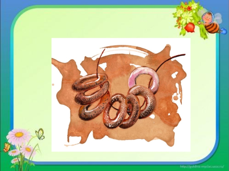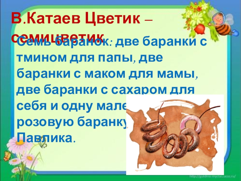 Семь баранок: две баранки с тмином для папы, две баранки с маком для мамы, две баранки с сахаром для себя и одну маленькую розовую баранку для братика Павлика.
