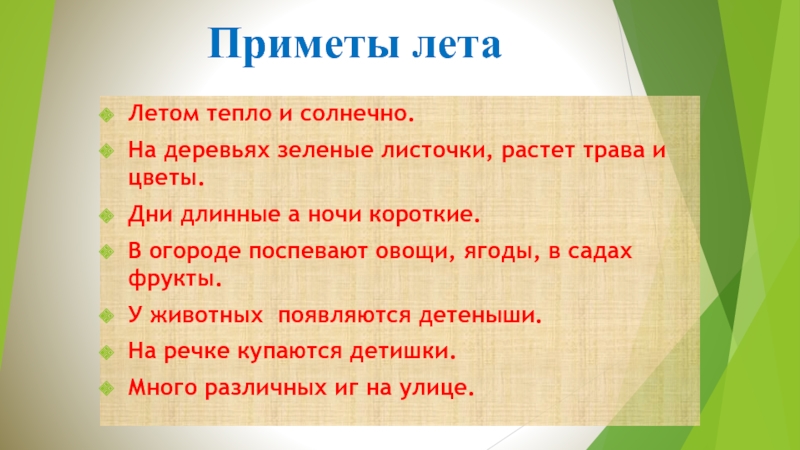 Приметы летаЛетом тепло и солнечно.На деревьях зеленые листочки, растет трава и цветы.Дни длинные а ночи короткие.В огороде