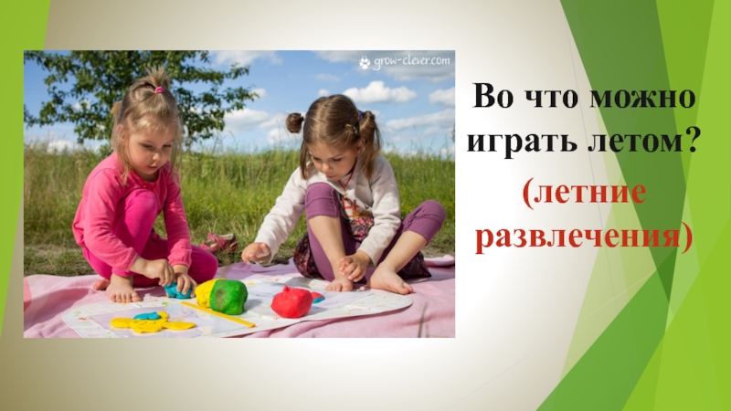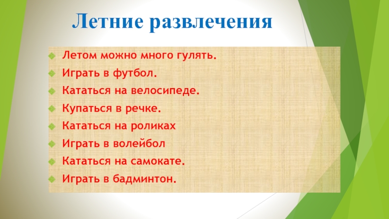 Летние развлеченияЛетом можно много гулять.Играть в футбол.Кататься на велосипеде.Купаться в речке.Кататься на роликахИграть в волейболКататься на самокате.Играть