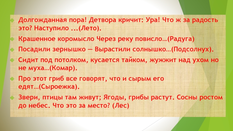 Долгожданная пора! Детвора кричит: Ура! Что ж за радость это? Наступило ...(Лето).Крашенное коромысло Через реку повисло…(Радуга)Посадили зернышко