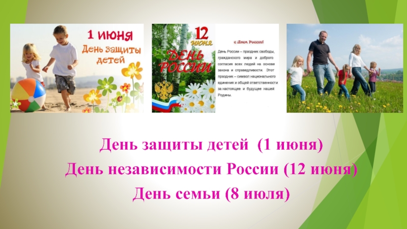 День защиты детей (1 июня)День независимости России (12 июня)День семьи (8 июля)