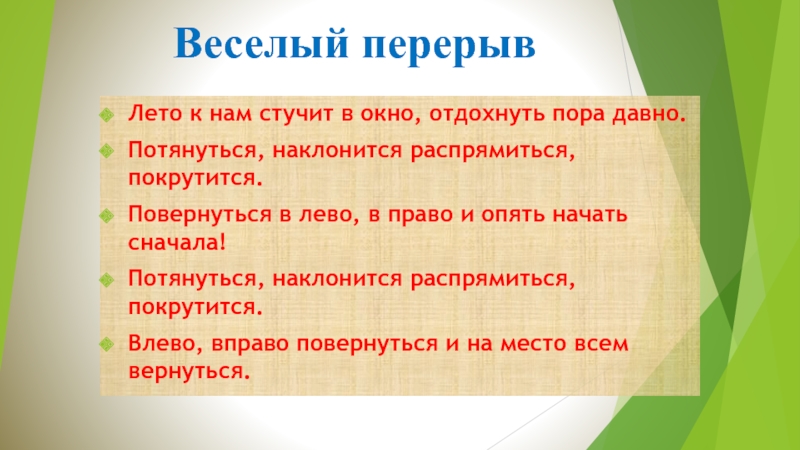 Веселый перерывЛето к нам стучит в окно, отдохнуть пора давно.Потянуться, наклонится распрямиться, покрутится.Повернуться в лево, в право