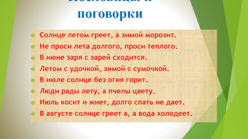 Пословицы и поговоркиСолнце летом греет, а зимой морозит.Не проси лета долгого, проси теплого.В июне заря с зарей