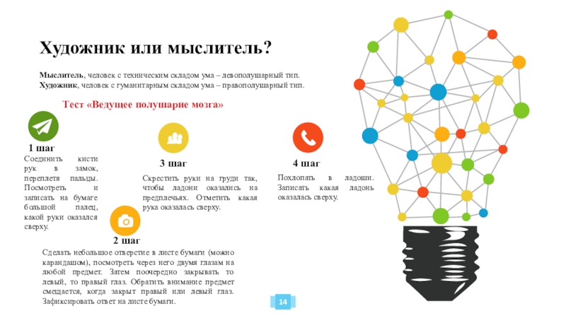 Соединить кисти рук в замок, переплетя пальцы. Посмотреть и записать на бумаге большой палец, какой руки оказался сверху.
