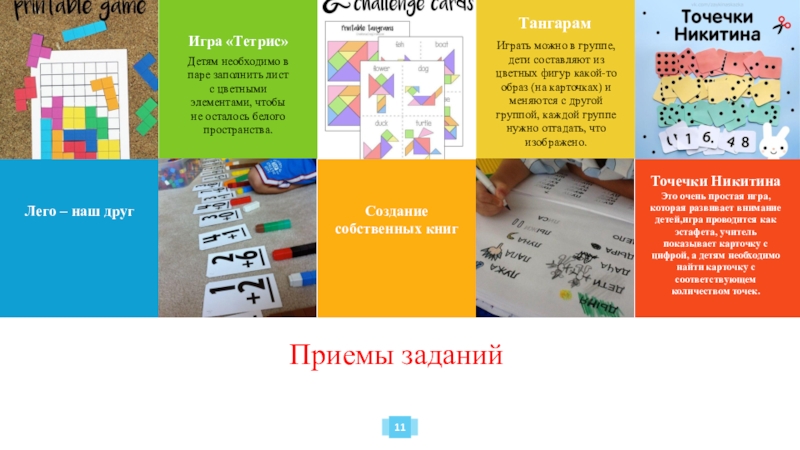 Играть можно в группе, дети составляют из цветных фигур какой-то образ (на карточках) и меняются с другой группой, каждой группе нужно отгадать, что изображено.