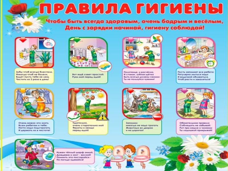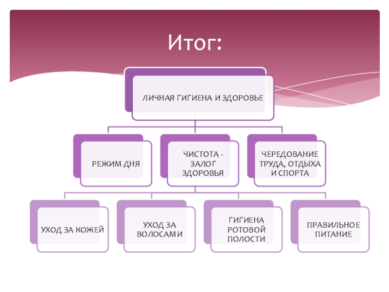 гигиенического режима в личной жизни и деятельности человека. Это уход за кожей, уход за полостью рта, в частности за зубами, содержание одежды и обуви в чистоте, поддержание порядка в квартире.