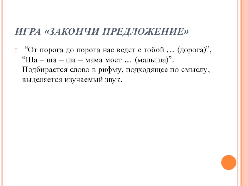 … (дорога)”, “Ша – ша – ша – мама моет … (малыша)”. Подбирается слово в рифму, подходящее по смыслу, выделяется изучаемый звук.