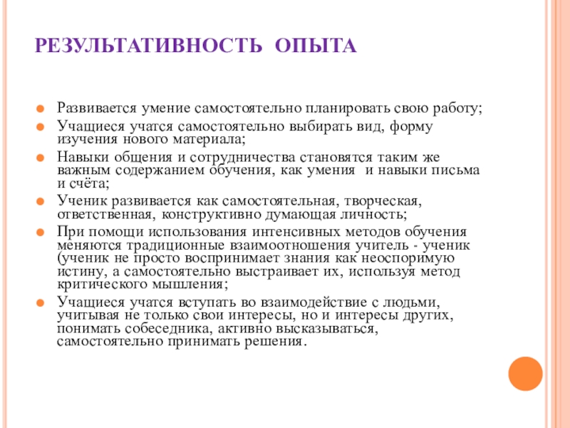 При помощи использования интенсивных методов обучения меняются традиционные взаимоотношения учитель - ученик (ученик не просто воспринимает знания как неоспоримую истину, а самостоятельно выстраивает их, используя метод критического мышления;