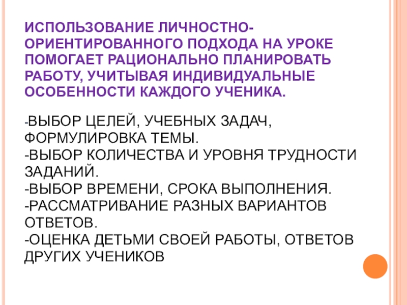 Слайд 5ИСПОЛЬЗОВАНИЕ ЛИЧНОСТНО- ОРИЕНТИРОВАННОГО ПОДХОДА НА УРОКЕ ПОМОГАЕТ РАЦИОНАЛЬНО ПЛАНИРОВАТЬ РАБОТУ, УЧИТЫВАЯ