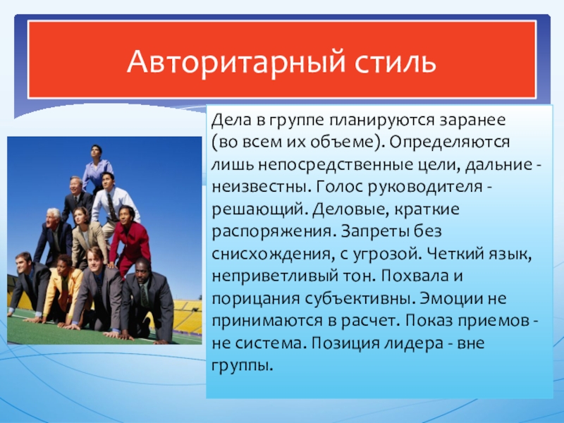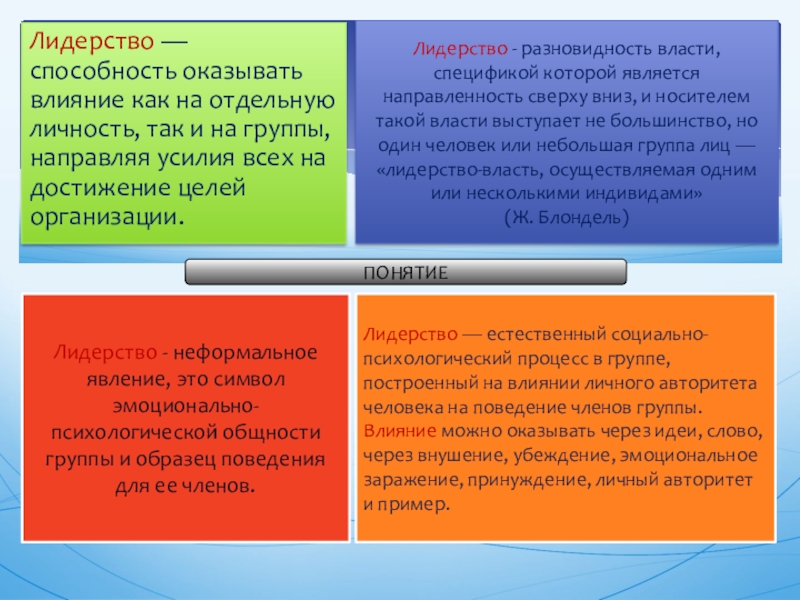 Лидерство — естественный социально-психологический процесс в группе, построенный на влиянии личного авторитета человека на поведение членов группы.