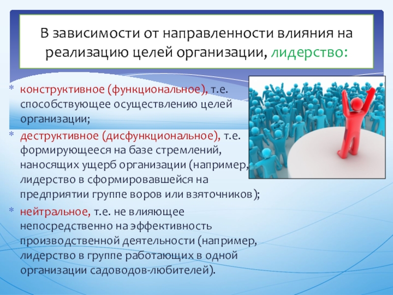 В зависимости от направленности влияния на реализацию целей организации, лидерство: