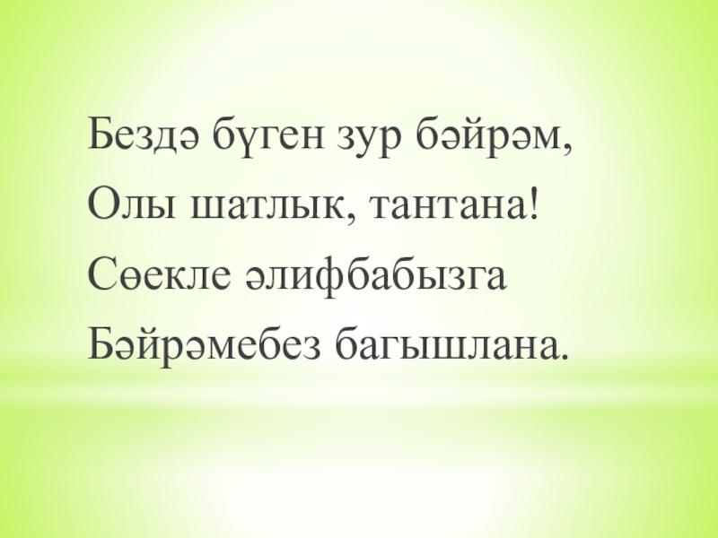 Бездә бүген зур бәйрәм,Олы шатлык, тантана! Сөекле әлифбабызгаБәйрәмебез багышлана.