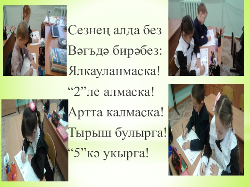 Сезнең алда безВәгъдә бирәбез:Ялкауланмаска!“2”ле алмаска!Артта калмаска!Тырыш булырга!“5”кә укырга!