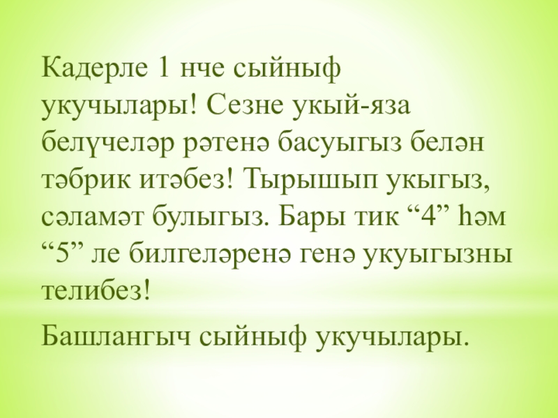 Слайд 21Кадерле 1 нче сыйныф укучылары! Сезне укый-яза белүчеләр рәтенә басуыгыз белән