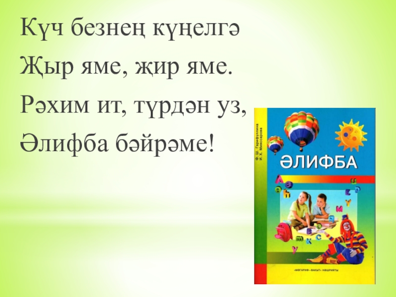 Күч безнең күңелгәҖыр яме, җир яме.Рәхим ит, түрдән уз,Әлифба бәйрәме!