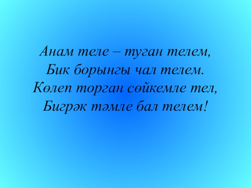 Слайд 17 Анам теле – туган телем, Бик борынгы чал телем. Көлеп торган сөйкемле тел, Бигрәк
