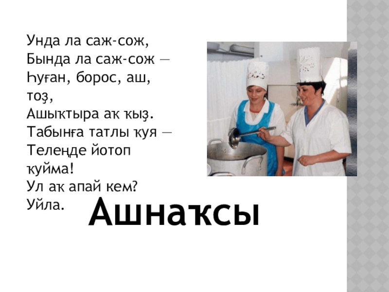Унда ла саж-сож, Бында ла саж-сож — Һуған, борос, аш,тоҙ, Ашыҡтыра аҡ ҡыҙ. Табынға татлы