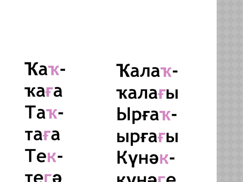 Ҡаҡ-ҡағаТаҡ-тағаТек-тегәҠалаҡ-ҡалағыЫрғаҡ-ырғағыКүнәк-күнәге