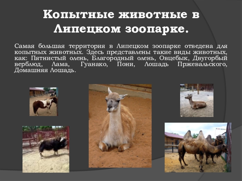 для копытных животных. Здесь представлены такие виды животных, как: Пятнистый олень, Благородный олень, Овцебык, Двугорбый верблюд, Лама, Гуанако, Пони, Лошадь Пржевальского, Домашняя Лошадь.