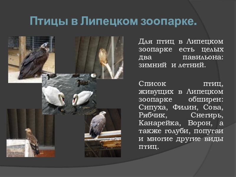Список птиц, живущих в Липецком зоопарке обширен: Сипуха, Филин, Сова, Рябчик, Снегирь, Канарейка, Ворон, а также голуби, попугаи и многие другие виды птиц.