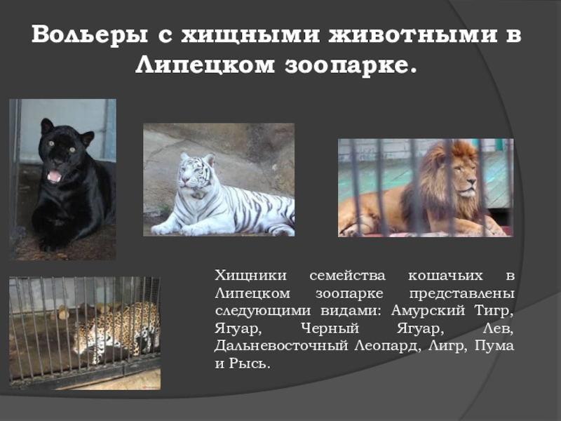 зоопарке представлены следующими видами: Амурский Тигр, Ягуар, Черный Ягуар, Лев, Дальневосточный Леопард, Лигр, Пума и Рысь.