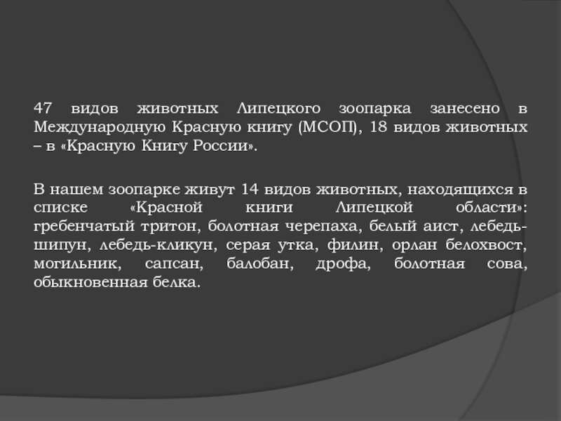 Слайд 947 видов животных Липецкого зоопарка занесено в Международную Красную книгу (МСОП),