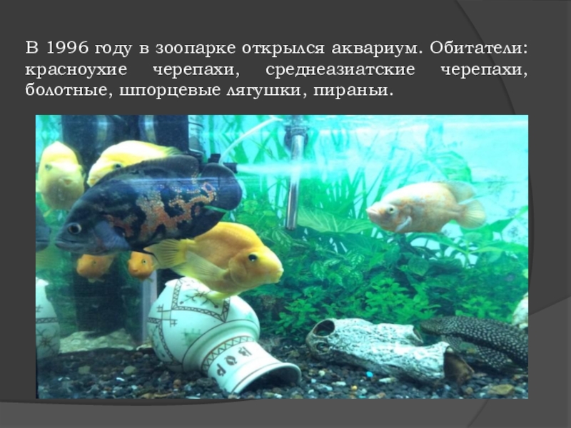 Слайд 10В 1996 году в зоопарке открылся аквариум. Обитатели: красноухие черепахи, среднеазиатские