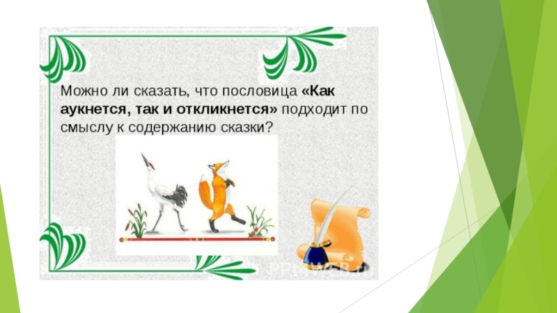 Слайд 11Какая поговорка лучше подходит для описания «ошибки» лисы?