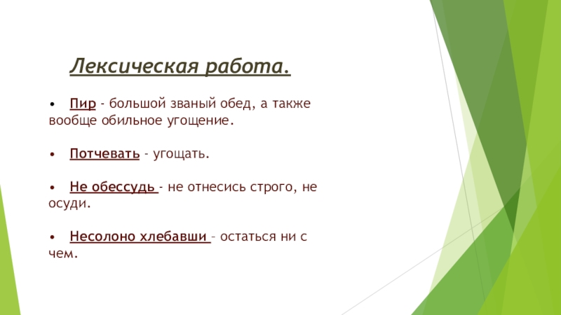 Лексическая работа.•	Пир - большой званый обед, а также вообще обильное угощение.•	Потчевать - угощать.•	Не обессудь - не отнесись