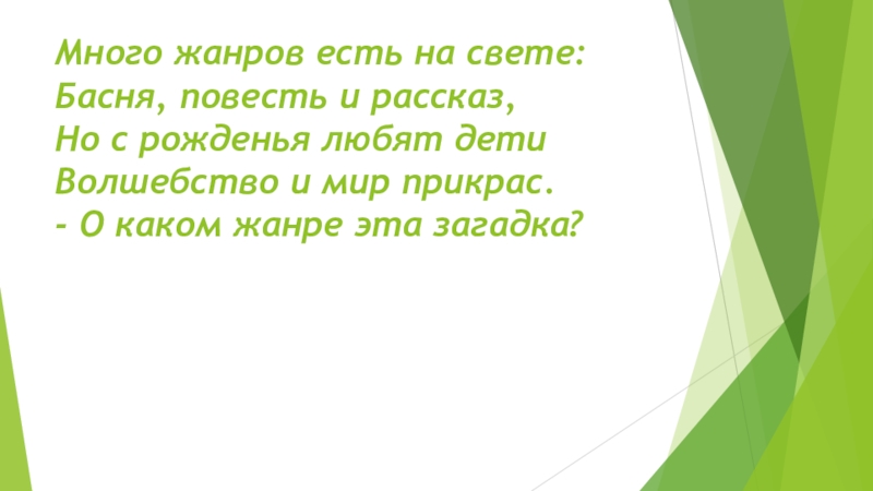 Много жанров есть на свете: Басня, повесть и рассказ, Но с рожденья любят дети Волшебство и мир прикрас. - О каком жанре эта загадка?