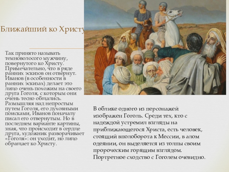 В облике одного из персонажей изображен Гоголь. Среди тех, кто с надеждой устремил взгляды на приближающегося Христа, есть человек, стоящий вполоборота к Мессии, в алом одеянии, он выделяется из толпы своим пророческим горящим взглядом. Портретное сходство с Гоголем очевидно.