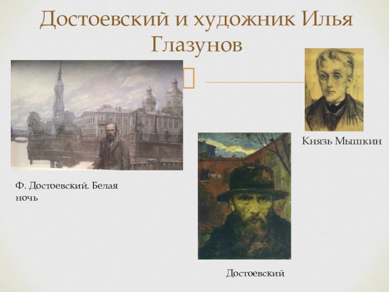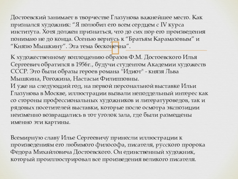 К художественному воплощению образов Ф.М. Достоевского Илья Сергеевич обратился в 1956г., будучи студентом Академии художеств СССР. Это были образы героев романа "Идиот" - князя Льва Мышкина, Рогожина, Настасьи Филипповны.