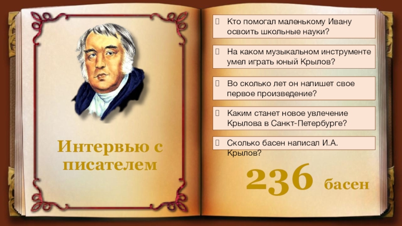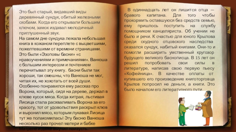 В одиннадцать лет он лишится отца — бравого капитана. Для того чтобы прокормить оставшуюся без средств семью, ему пришлось поступить на службу помощником канцеляриста. Об учении не было и речи. К счастью для юного Крылова среди скудного отцовского наследства оказался сундук, набитый книгами. Они-то и помогли расширить умственный кругозор будущего великого баснописца. В 15 лет он решил попробовать свои силы в литературе, написав свою первую пьесу «Кофейница». В качестве оплаты от купившего его произведение книготорговца Крылов попросил не деньги, а книги. Это было началом его литературного пути.