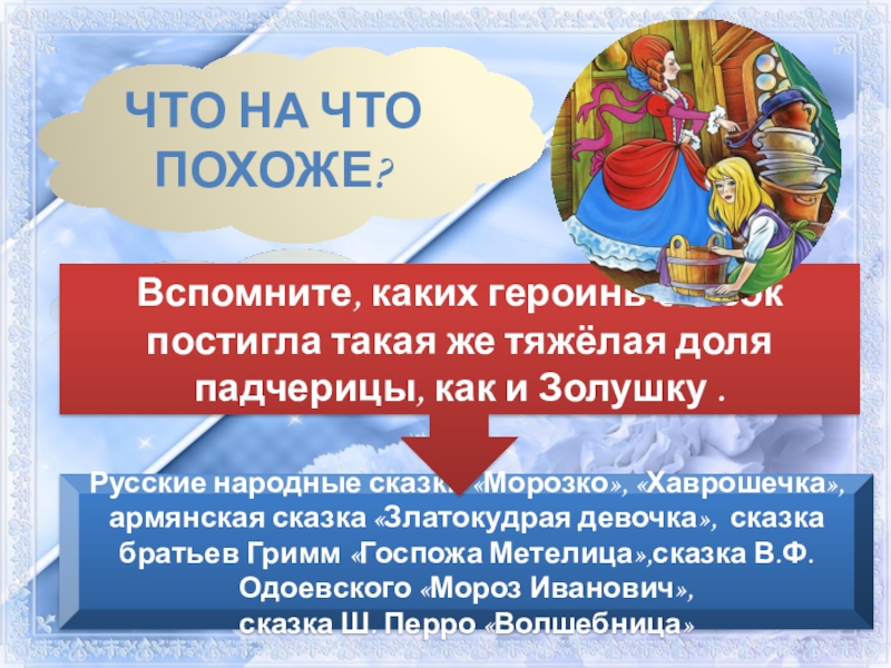 Вспомните, каких героинь сказок постигла такая же тяжёлая доля падчерицы, как и Золушку .