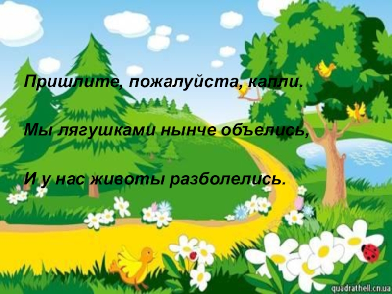 Пришлите, пожалуйста, капли.		Мы лягушками нынче объелись,		И у нас животы разболелись.