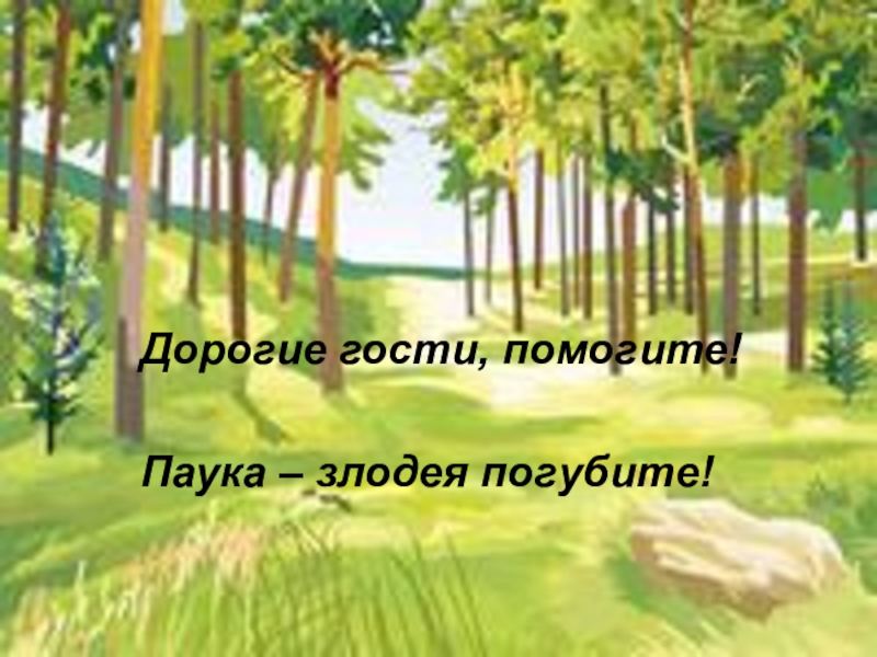 Дорогие гости, помогите!			Паука – злодея погубите!