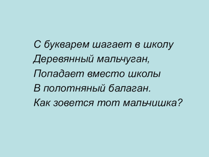 С букварем шагает в школу Деревянный мальчуган, Попадает вместо школы В полотняный балаган. Как зовется тот мальчишка?