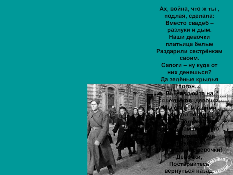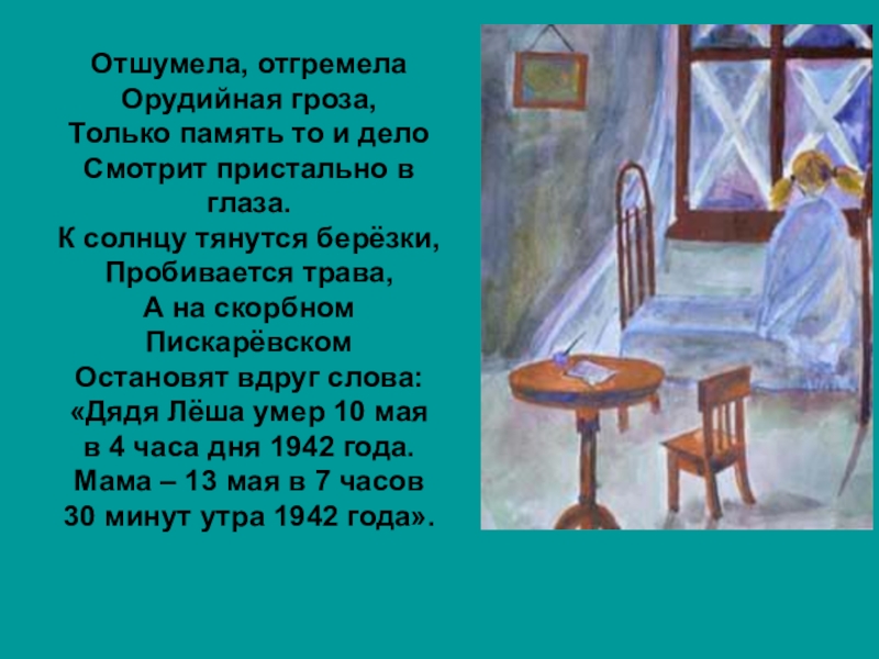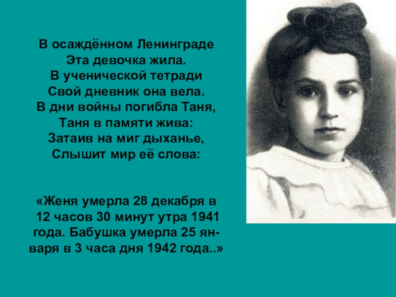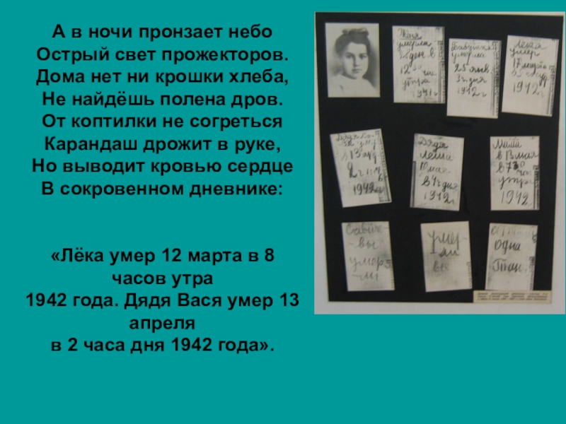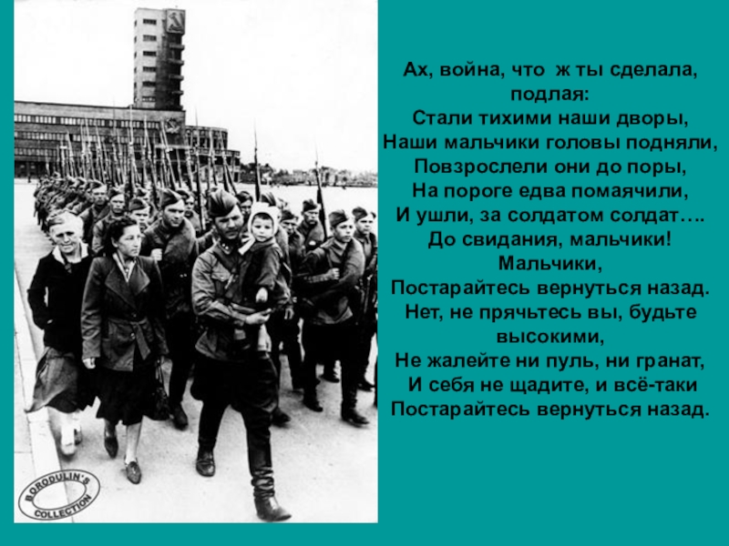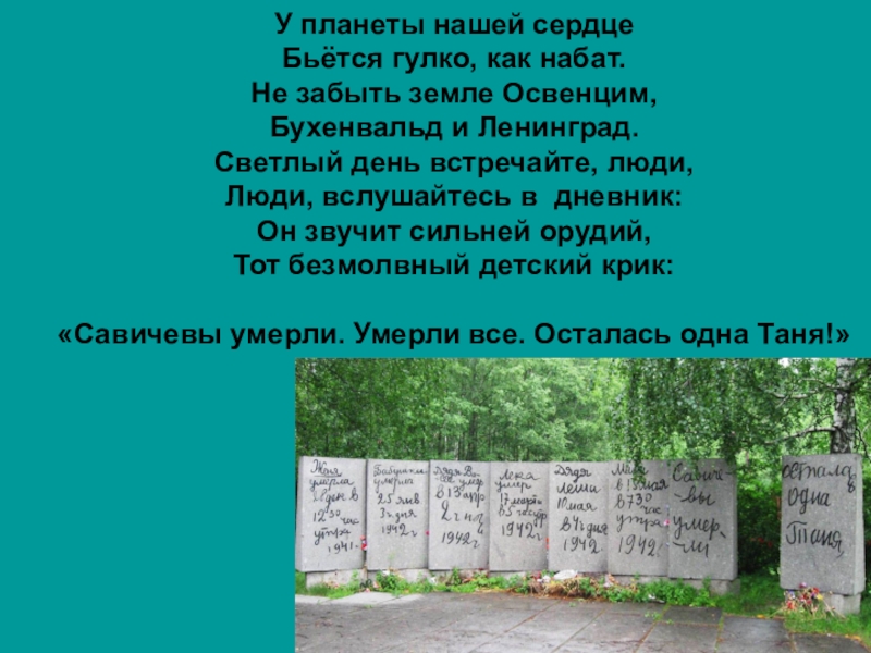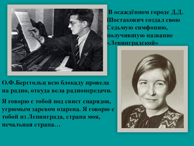 Я говорю с тобой под свист снарядов, угрюмым заревом озарена. Я говорю с тобой из Ленинграда, страна моя, печальная страна…