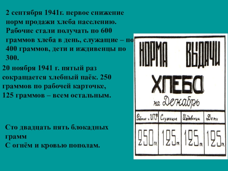 20 ноября 1941 г. пятый раз сокращается хлебный паёк. 250 граммов по рабочей карточке, 125 граммов – всем остальным.
