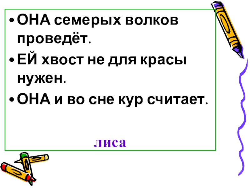 ОНА семерых волков проведёт.ЕЙ хвост не для красы нужен.ОНА и во сне кур считает. лиса