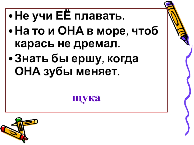 Не учи ЕЁ плавать.На то и ОНА в море, чтоб карась не дремал.Знать бы ершу, когда ОНА
