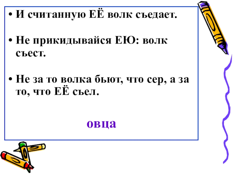 И считанную ЕЁ волк съедает. Не прикидывайся ЕЮ: волк съест. Не за то волка бьют, что сер,