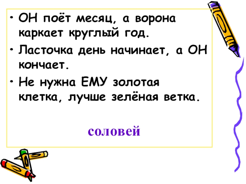 ОН поёт месяц, а ворона каркает круглый год.Ласточка день начинает, а ОН кончает.Не нужна ЕМУ золотая клетка,
