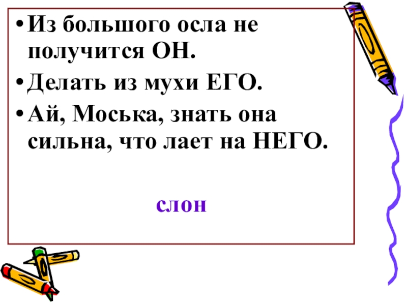 Из большого осла не получится ОН.Делать из мухи ЕГО.Ай, Моська, знать она сильна, что лает на НЕГО.