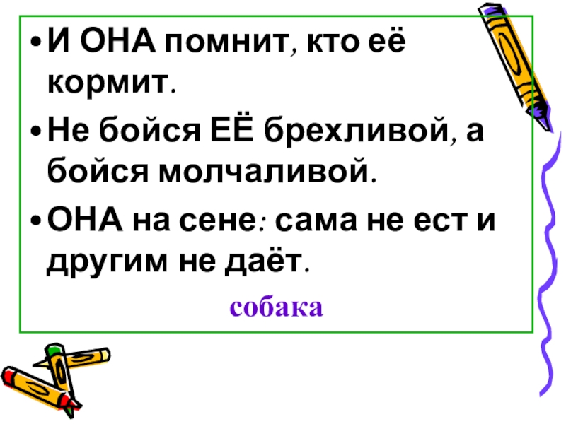 И ОНА помнит, кто её кормит.Не бойся ЕЁ брехливой, а бойся молчаливой.ОНА на сене: сама не ест