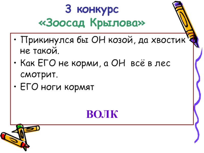 3 конкурс  «Зоосад Крылова»Прикинулся бы ОН козой, да хвостик не такой.Как ЕГО не корми, а ОН