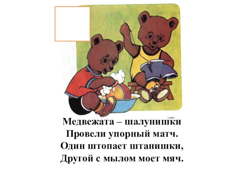 Медвежата – шалунишкиПровели упорный матч.Один штопает штанишки,Другой с мылом моет мяч.